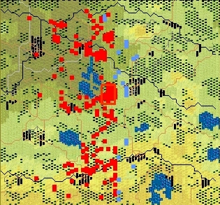 A opět tu je jump mapa a pohled na frontu z naší strany. Na severu je jasně vidět krize kolem Narvy, která zde vznikla. 566344 je zatlačen až do Miakotina a Alfred