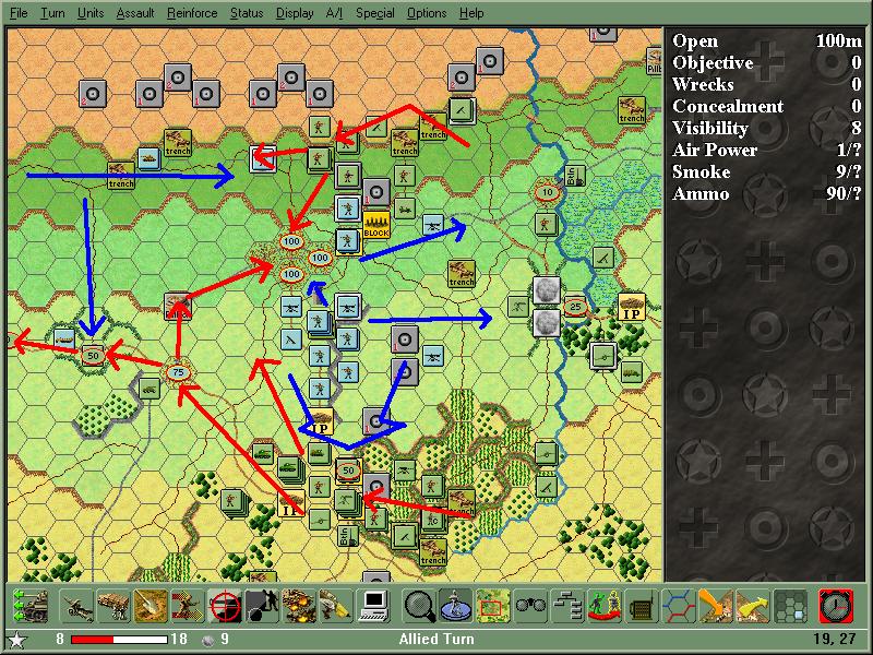 V žádném případě jsem se neodvážil útočit čelně, takže jsem rotu „E“(2.Btln) poslal po plážích obejít německé předpokládané pozice a zaútočit na město ze severozápadu. Tanková rota si to namířila po silnici k Poix. Jenže J-Z od Poix stála baterie 88mm děl. „Bum“ a 2 tanky hořely!!! Další 88tky stály hned za betonovým bunkrem nad městem a zastřelovaly se na postavení 2.praporu. Poslední baterie 88mm zabijáků jsem objevil S-Z od Grandcamp. Aby toho nebylo málo, tak LMG četa z roty „K“ při svém průzkumu směrem k Poix objevila baterii AT děl J-Z směrem, která spolu s 88tkami kontrolovala přístupy k Poix po silnici. Naštěstí jsem celkem slušně odhadl nepřátelské pozice a dobře zaměřená palba děl napáchala dost škod.