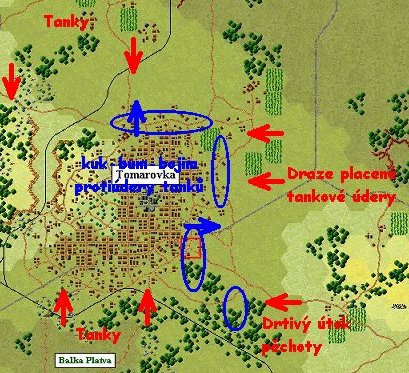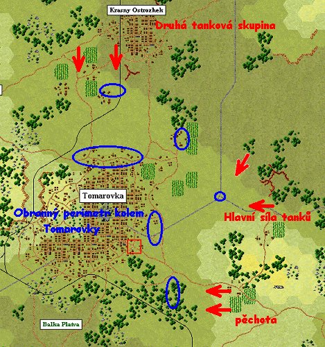 Ruské jednotky jsou soustředěné na třech místech - většina pěchoty JV od Tomarovky, velká kolona tanků a další pěchota V od Tomarovky a konečně poslední kolona složená pouze z tanků S od Tomarovky. Rusové mají značnou výhodu v početní převaze a navíc Kajik už se mnou tento scénář hrál s prohozenými stranami a tak přesně znal rozmístění a hlavně slabiny německé obrany.